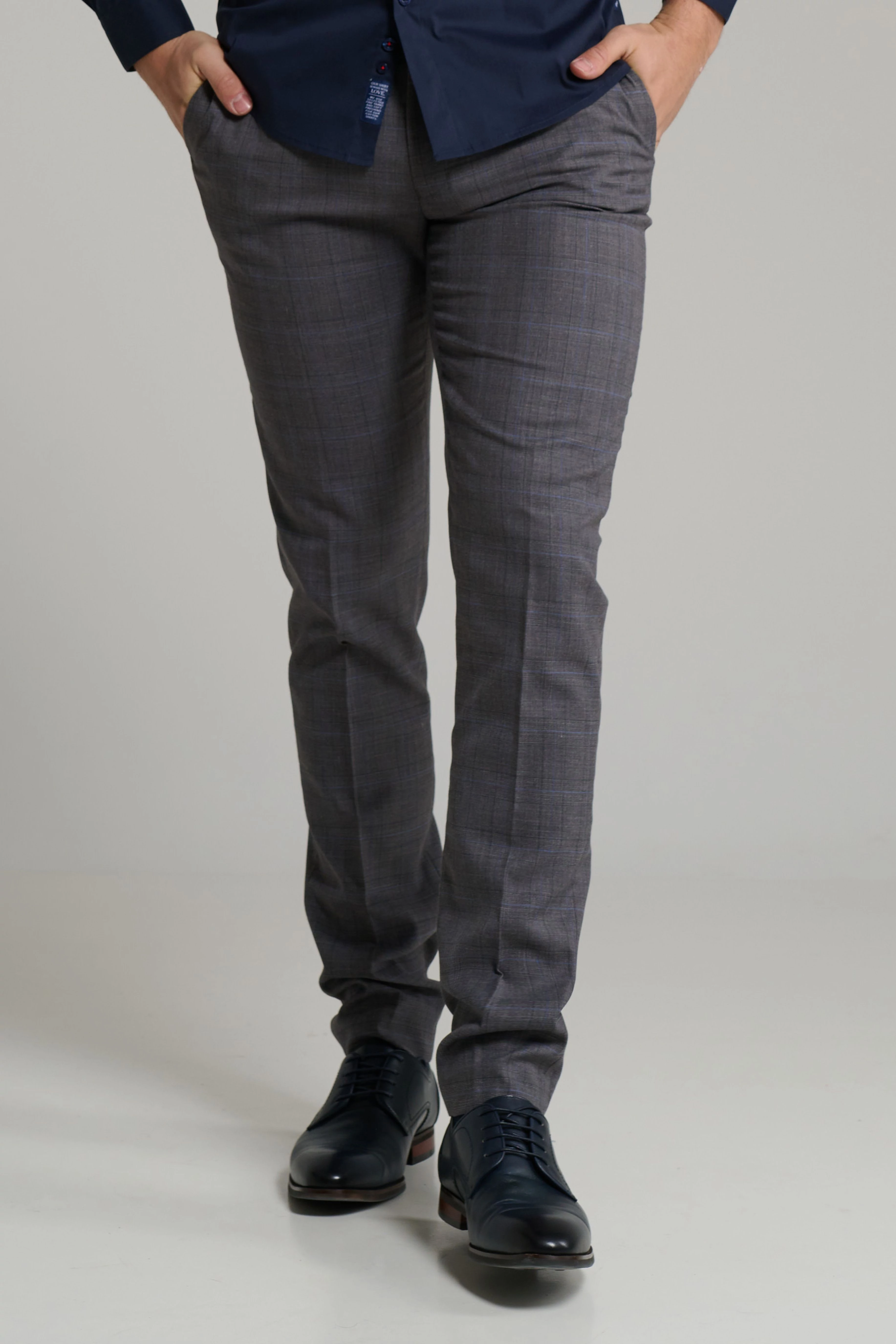 Slim-fit, szűkített fazonú svédzsebes nadrág. Sötétszürke színű, keskeny kockás anyagból. Övbújtatós derékrésszel, csíkos belső derékpánttal, eleje cipzáras záródással, logózott fém kellékkel. Anyagösszetétel: enyhén elasztikus, 83%poliészter-15%viszkóz-2%elasztán.