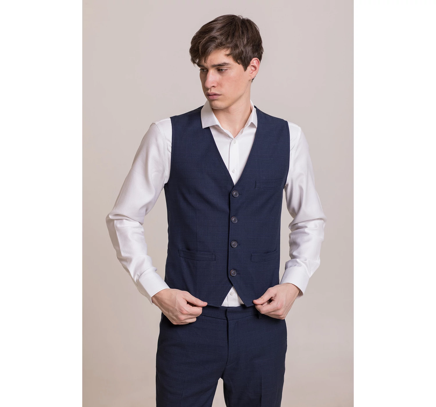 Egysoros, középkék színű tone in tone kockás, szövött anyagú mellény. Elején három zsebbel. Hátul állítható pánttal. Bélelt. Testhezálló sziluettet eredményező, szűk fazon. Bélelt. Anyagösszetétel: 83%poliészter-15%viszkóz-2%elasztán. Nick Utura zakóval kombinálható.